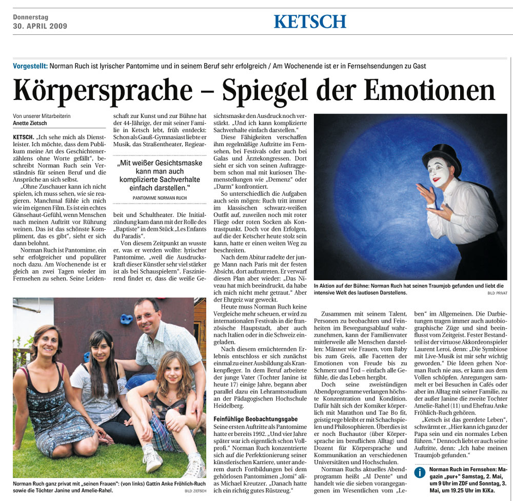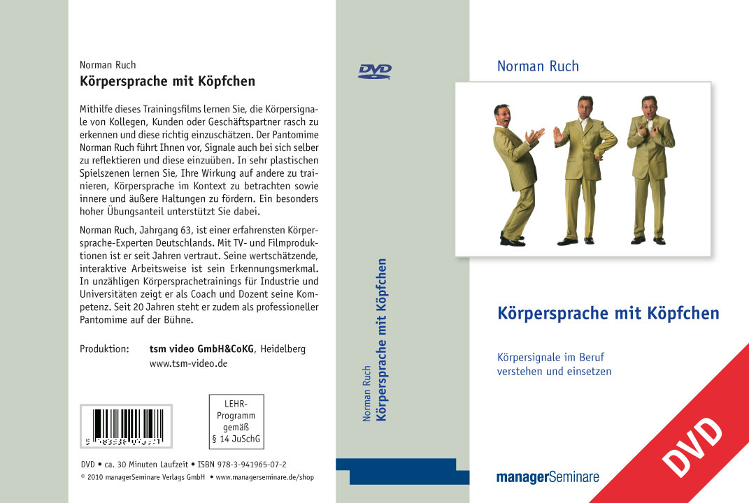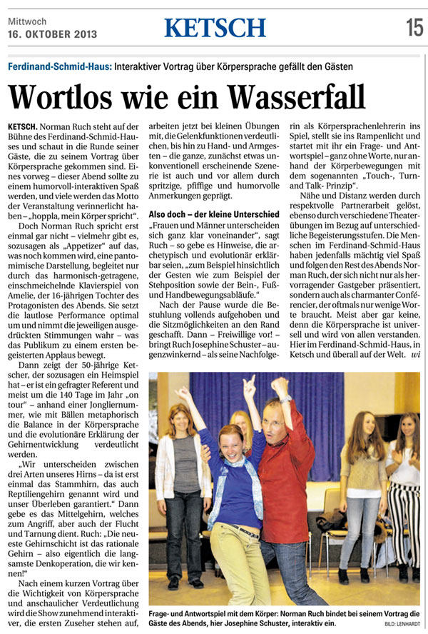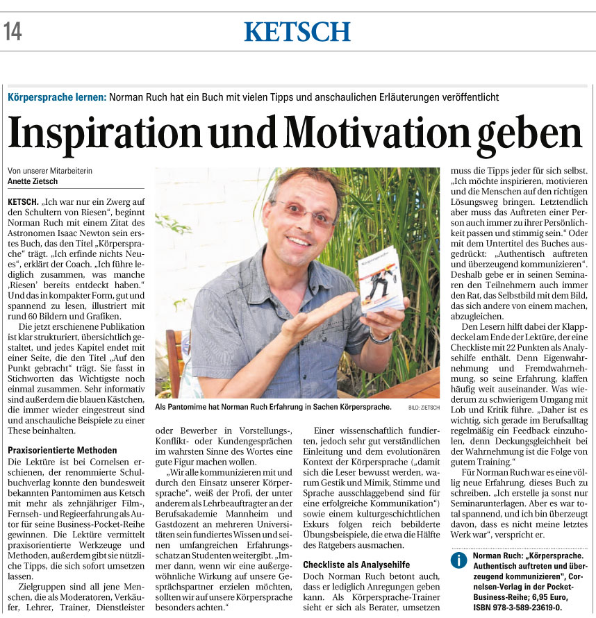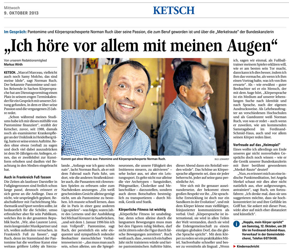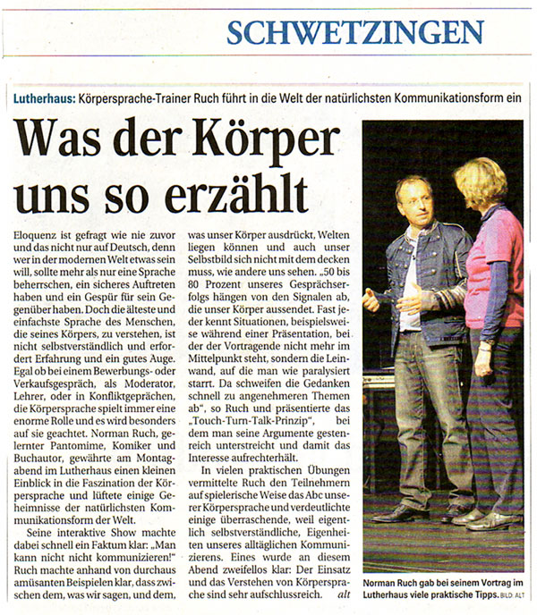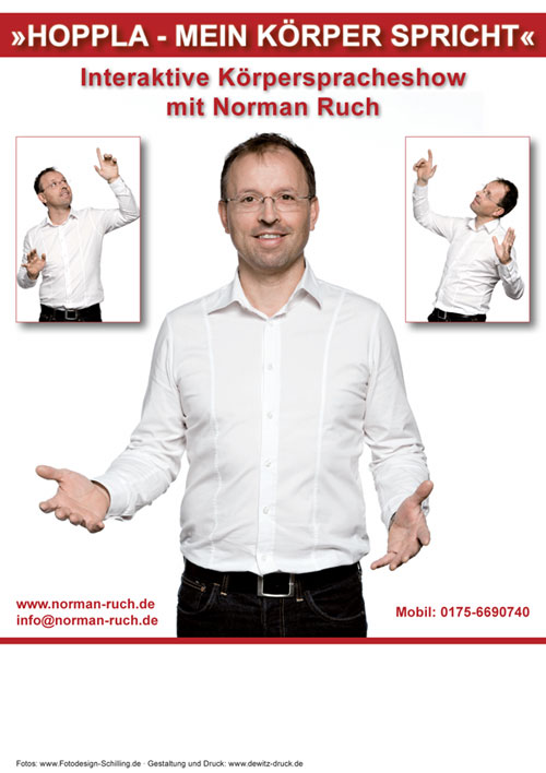 ![]() Der Körper spricht immer, manchmal bewusst, oftmals eher unbewusst! Norman Ruch 2013 ![]() Jetzt der Text: Der Körpersprachetrainer Norman Ruch gilt als bundesweiter Spezialist seines Fache und sieht sich in der Tradition von Samy Molcho, Marcel Marceuax, Charlie Chaplin, Jomi, Michael Kreutzer und Paul Eckman. Als gelernter Krankenpfleger erwarb er sich wichtige Beobachtungsfähigkeiten, als Student der Musik und Mathematik und als Pantomime in seiner künstlerisch, artistischen Ausbildung weitere Kompetenzen, die durch die Coachingausbildung als systemischen Berater verfeinert wurden. So entwickelte Norman Ruch einen authentischen Weg zu sich selbst und gibt seine Erfahrung und Kompetenz an seine Teilnehmer-innen engagiert motivierend weiter. Die innere Haltung ist für ihn entscheidend, Wertschätzung und Würdigung der Teilnehmer sind Säulen der Trainings und Coachings. |